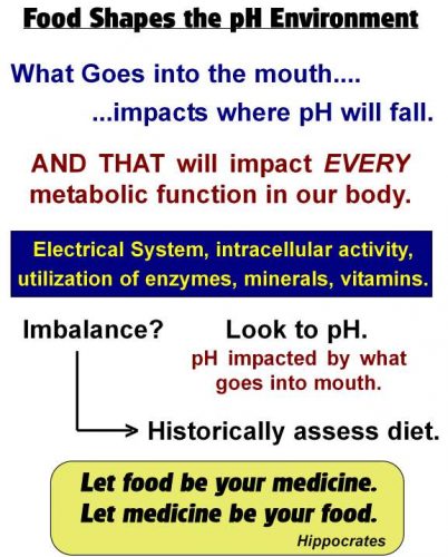 pH is behind the body’s electrical system and intracellular activity as well as the way our bodies utilize enzymes, minerals, and vitamins. That is why pH is one of the first things to be looked at if you are experiencing unbalance in your body in any way, shape, or form. And since our body’s pH level is a direct result of what we eat and drink, anytime we are experiencing imbalance, we need to look at what we have historically been eating and drinking because this impacts our pH. It’s a circle. You can’t look at one without looking at the other.