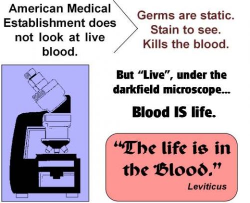 For example, the American medical establishment rarely looks at live blood. Their practice of staining blood with chemicals kills it. It also kills the ability to really “see” what is going on. But in looking at live blood, you can clearly “see” that there are forms that look like bacteria, microorganisms and parasites that not only are in the blood, but that over time can grow and can change their shapes. Some researchers suggest they these forms are markers for pathogenic (disease producing) states. (This ability of microorganisms to change is the concept of pleomorphism we’ve been discussing.) Understanding this concept is essential to the understanding of cancer and its cure, and the cure of many other diseases.
