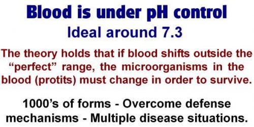Remember that blood is under pH control. Ideally it has a pH in a narrow range around 7.3, which is slightly alkaline. In Enderlein’s theory, a pH around 7.3 is the perfect environment in which the element he called the protit lives in harmony with the body. But when blood pH is disturbed and is shifted out of that narrow range, these tiny elements (which he though of as living microorganisms) can no longer survive. In order to survive, he suggested that they would change to a form which can survive. It is these new forms that he stated can become aggressive, parasitic and pathogenic agents within the blood.