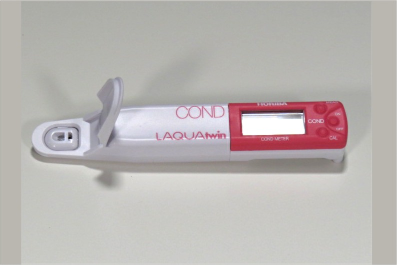 Here’s a picture of a simple conductivity meter. Not all meters are the same. Two important things you have to have in your meter are the ability to do small sample size (for saliva) and an auto-