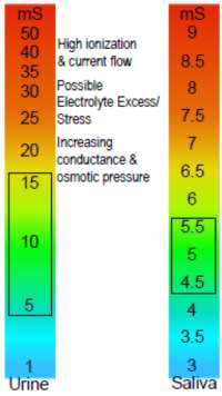 We have a generally healthy zone of conductivity from 7mS to 16mS for urine and 4.5mS to 5.5mS for saliva.