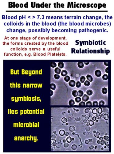The human body strives to maintain the pH of the blood at around 7.3. Above or below this level, the colloids in your blood merge into forms that can look kind of scary when viewed under a microscope. One contention is that these forms constitute pathogenic microbes. Another (more likely scenario based on the latest DNA studies discussed later) is that these forms seen in the blood are not really life forms with their own DNA, but are forms that develop in synchronicity with pathogenic situations that develop as a result of internal terrain modifiers which also affect immune function. In essence, the vast majority of scary forms seen in the blood are re-