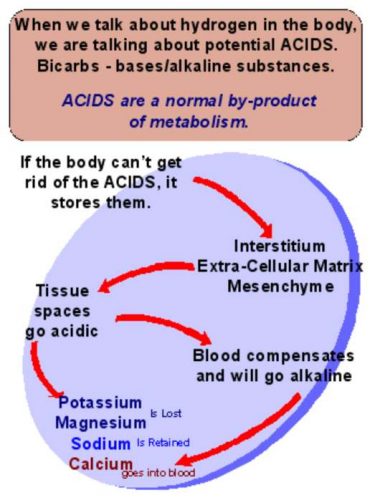 As more acid accumulates in tissues, as this story goes, it gets stored and pushed further, and ultimately it gets pushed into the cell. When it gets pushed into the cell, the first thing it does is displace POTASSIUM and then MAGNESIUM and then SODIUM.