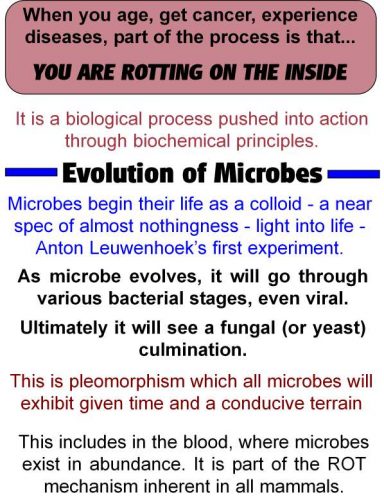 Which brings us to the blood. There are forms in the blood that look like foreign microbes. If the blood terrain changes (i.e. pH, etc.), these forms can change their shape. They can look bacterial, like yeast, like fungus. Upon seeing this in the blood many go yep, there is a fungus among us, and it’s in our blood. If this is so, given the proper terrain (or more to the point, the improper terrain) you’re going to get ROT, part of the biological aging and disease process.