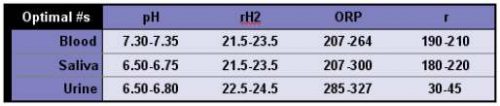 In order to accurately assess results, it is important to have a set of guidelines or optimum values to measure against. Below is a table with the optimum pH, rH2, ORP, and resistivity (r) values for blood, saliva, and urine that were established by Professor Claude Vincent. However, knowing how far away test results are from these optimum values is only the first step. You must also understand what these measurements mean in order to make some determination of how these deviations could be affecting internal homeostasis.